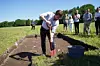 Klima- og miljøminister Sveinung Rotevatn tar første spadetak i utgravingen av Gjellestadskipet. Utgravingen er ventet å ta fem måneder, og det er første gang på over 100 år at et vikingskip blir gravd fram i Norge. Foto: Fredrik Hagen / NTB scanpix